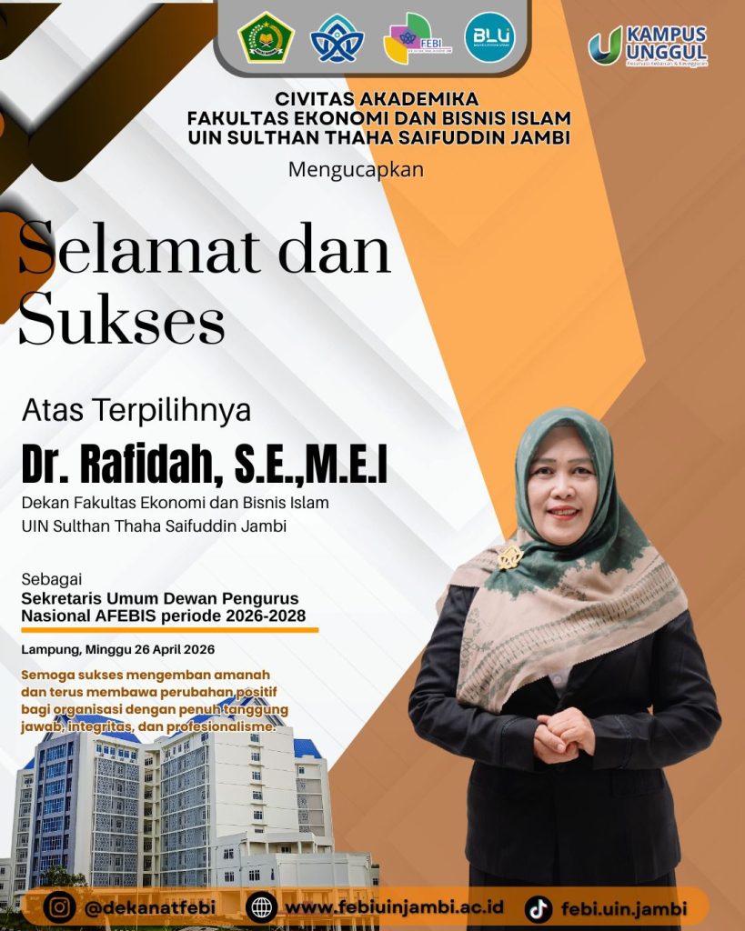 Keluarga besar FEBI UIN STS Jambi menyampaikan ucapan selamat dan sukses atas amanah baru yang diemban Dr. Rafidah sebagai Sekretaris Umum DPN AFEBIS periode 2026–2028.